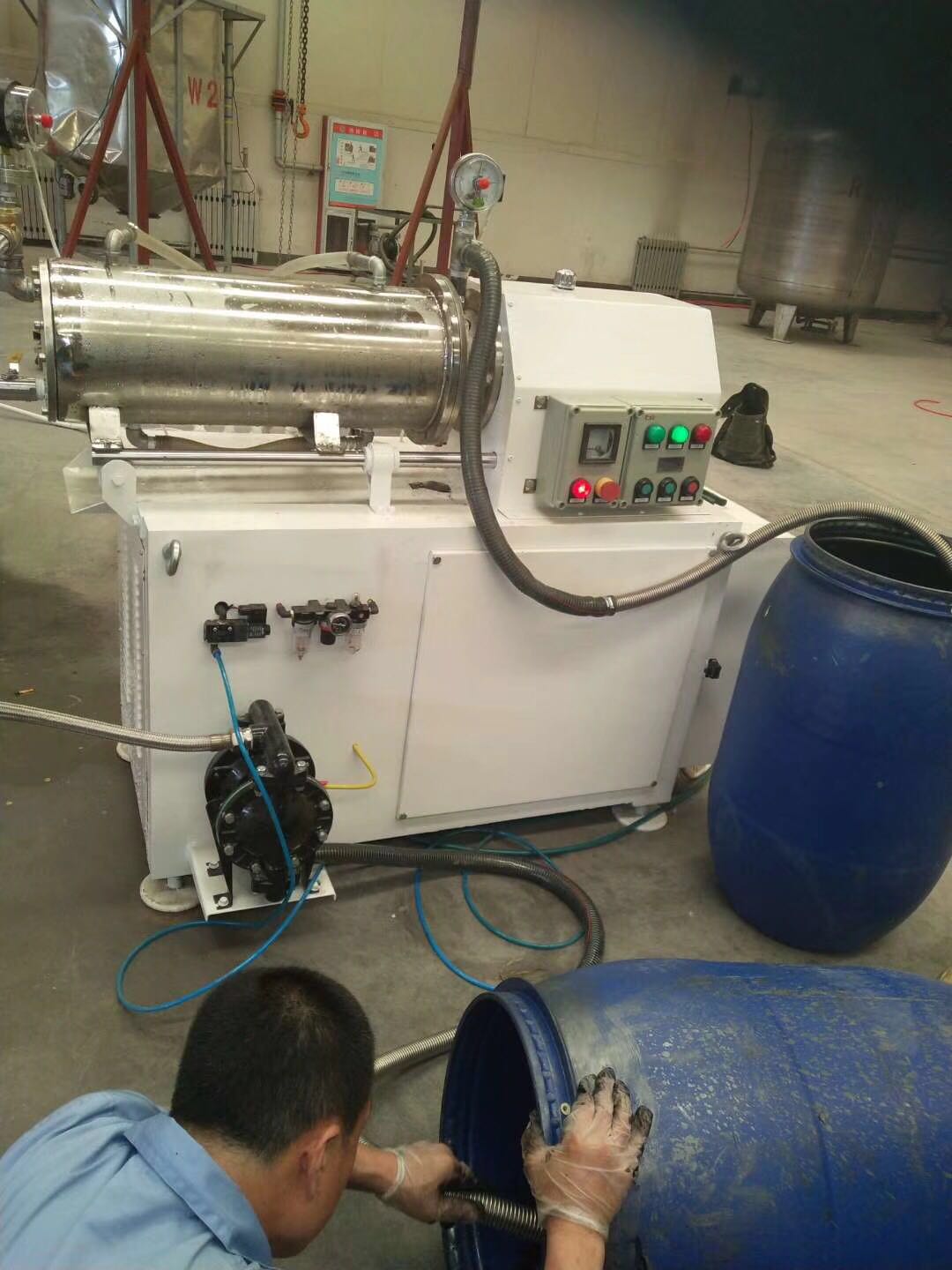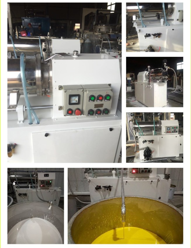 是利用料泵將經(jīng)過攪拌機預分散潤濕處理后的固-液相混合物料輸入筒體內(nèi),物料和筒體內(nèi)的研磨介質(zhì)一起被高速旋轉(zhuǎn)的分散器攪動,從而使物料中的固體 微粒和研磨介質(zhì)相互間產(chǎn)生更加強烈的碰撞、摩擦、剪切作用,達到加快磨細微粒和分散聚集體的目的。研磨分散后的物料經(jīng)過動態(tài)分離器分離研磨介質(zhì),從出料管流出。臥式砂磨機特別適合分散研磨粘度高而粒度要求細的產(chǎn)品。